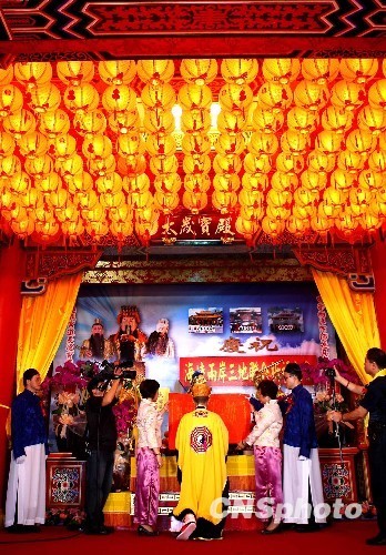 海峽兩岸三地道教界代表29日在臺北指南宮,藉紀念孚佑帝君呂洞賓成道1130周年活動,聯合舉行祈福大會,共同祈愿兩岸風調雨順,和諧安定,繁榮發展。