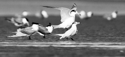 圖為中華鳳頭燕鷗(右側(cè)兩只)在閩江口鱔魚灘求偶。 高川攝