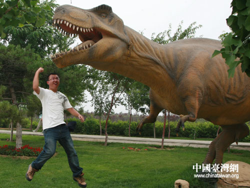 夏令營的營員與恐龍合影(圖片來源:遼寧省朝陽市臺辦)