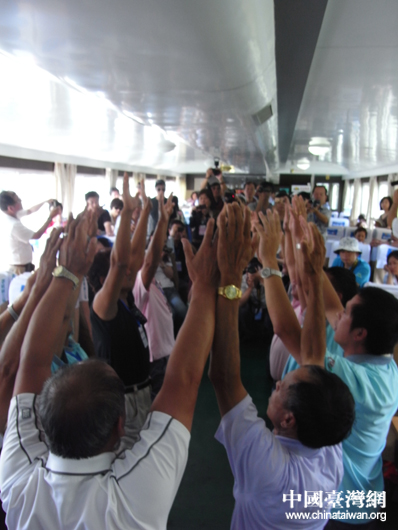 臺灣文化界人士在漓江上合影留念(中國臺灣網 蕪同 攝)
