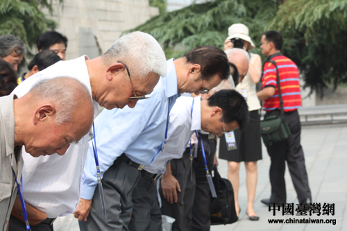 海內(nèi)外黃埔軍校同學(xué)會的校友、親屬、專家學(xué)者向遇難同胞三鞠躬。(中國臺灣網(wǎng) 肖燕 攝)