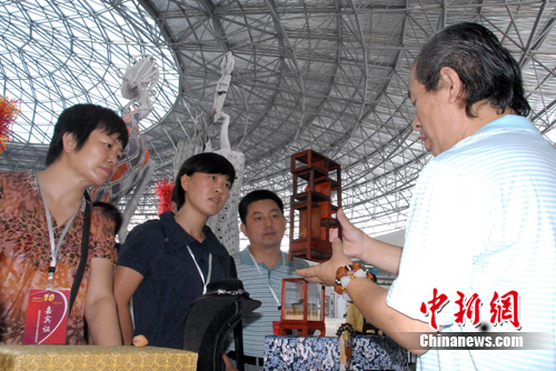 在東南東文化創意產業園內舉辦的2010海峽兩岸特色產品博覽會吸引了全國各地的觀眾,圖為參展藝術家向觀眾展示自己的作品。