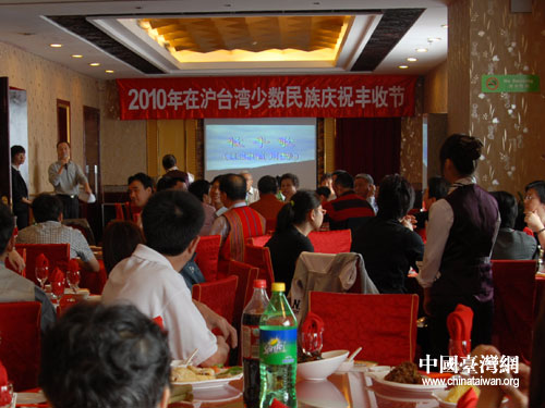 中國臺灣網10月11日上海消息 10月10日,上海市臺聯舉辦2010年在滬臺灣少數民族豐收節聯誼活動,在滬的臺灣阿美族、排灣族、泰雅族、平埔族等少數民族家庭20余戶50余人參加了隆重的豐收節慶祝活動。上海市臺聯副會長張企龍致辭,市民宗委李偉民處長應邀出席并講話,市臺聯副秘書長江國強介紹了臺灣少數民族慶祝豐收節的傳統習俗及臺灣少數民族稱謂的變化,并與高文海、甘錦凱、韓若冰先生分別代表本氏族共同主持祭典。