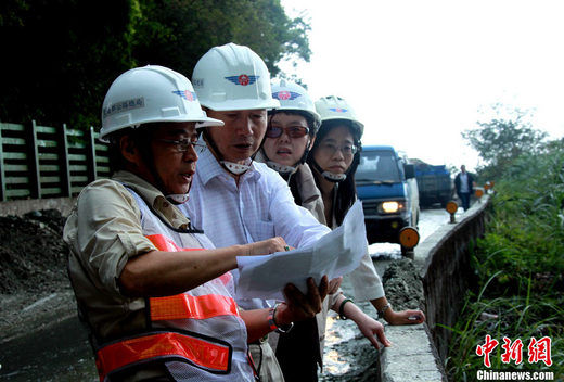 10月25日,海峽兩岸旅游交流協(xié)會臺北辦事處主任范貴山(左2)、海峽兩岸旅游交流協(xié)會副秘書長李亞瑩(左3)等,來到發(fā)生大面積塌方的臺灣蘇花公路114.5公里現(xiàn)場,了解救援進(jìn)展。中新社記者王健 攝