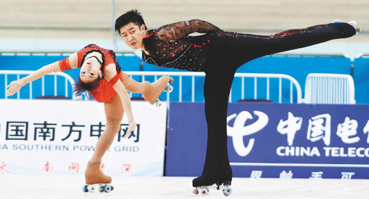 陳立昕(右)及翁慈霞昨天在亞運(yùn)滑輪溜冰花式雙人組短曲預(yù)賽暫居第一,今天拼金牌,也是抗癌大作戰(zhàn)。