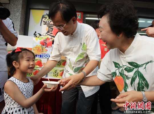資料圖:6月18日下午,臺南縣縣長蘇煥智攜夫人身穿芒果裝,現身上海一家7-ELEVEn門店,促銷臺南縣特有的優質水果——愛文芒果。中新社發 潘索菲 攝