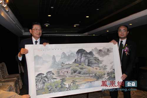大陸參訪團團長李強向江丙坤贈送禮物左江丙坤右李強。(圖片來源:鳳凰網公益)