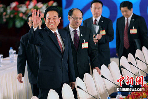 12月21日上午,海協(xié)會(huì)會(huì)長陳云林與海基會(huì)董事長江丙坤的兩會(huì)領(lǐng)導(dǎo)人第六次會(huì)談在臺北圓山飯店登場。圖為陳云林在落座前向到場采訪媒體致意。中新社記者 黃少華 攝