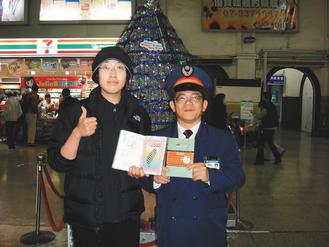 來(lái)自北京的交換學(xué)生傅超(左)臺(tái)南站集滿百戳,與臺(tái)南站長(zhǎng)陳榮彬合影。圖片來(lái)源:臺(tái)灣《聯(lián)合報(bào)》