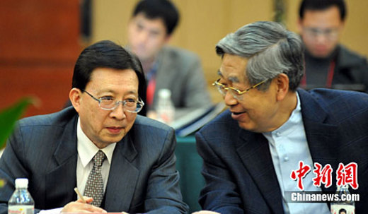 1月18日,第九屆兩岸關(guān)系研討會在廣西桂林開幕。會上,中華文化發(fā)展促進會會長許嘉璐與臺灣中華文化總會會長劉兆玄親切交流。中新社記者 蔣雪林 攝