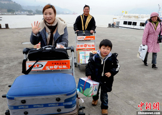1月19日春運首日,乘坐“兩馬” ( 馬尾——馬祖)航線“閩珠一號”客輪返鄉(xiāng)過年的臺胞抵達福州港馬尾客運碼頭。預計春運期間“兩馬”航線運送旅客人數(shù)約5000人次。2011年是“兩馬”航線運行的第十一個年頭,十年間,福州邊檢站共檢查兩岸直航船舶7386艘次,旅客395564人次。中新社記者 劉可耕 攝