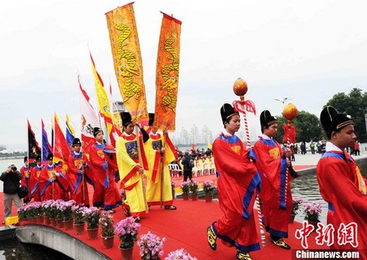 2月14日,以“弘揚(yáng)臨水文化、促進(jìn)兩岸交流”為主題的第四屆陳靖姑(福州)文化節(jié)在福州市南江濱公園九龍壁隆重舉行,吸引了來(lái)自兩岸各地近千名來(lái)賓及信眾同謁臨水夫人陳靖姑。圖為祭祀大典上的儀仗隊(duì)。中新社記者 劉可耕 攝