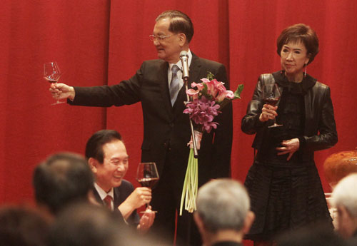 報道說,26日晚國民黨榮譽主席連戰設立晚宴,宴請海協會經貿代表團。連戰特地贈送一幅自己寫的“報德存忠厚、懷仁豫太和”給陳云林,連戰笑稱“字寫不好,但獨樹一格”;陳云林也回贈一幅熊貓國畫。