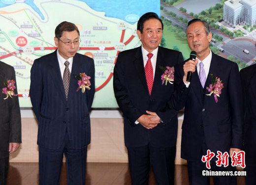 2月27日上午,正在臺灣參訪的大陸海協會會長陳云林一行分別到臺北港、遠雄自由貿易港區參觀考察。圖為陳云林(中)在臺灣海基會副董事長高孔廉(左一)陪同下參觀位于桃園縣大園鄉的遠雄自由貿易港區,遠雄企業團董事長趙藤雄(右一)作現場介紹。中新社記者 符永康 攝