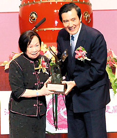 馬英九頒發(fā)“兩岸和平特殊貢獻(xiàn)獎(jiǎng)”給前海基會(huì)董事長(zhǎng)辜振甫夫人辜嚴(yán)倬云女士。圖片來(lái)源:臺(tái)灣《經(jīng)濟(jì)日?qǐng)?bào)》