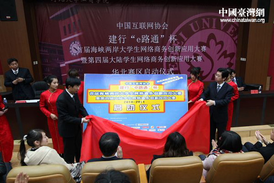 中國(guó)臺(tái)灣網(wǎng)3月10日保定消息 隨著中國(guó)建設(shè)銀行河北省分行副行長(zhǎng)周小知與河北大學(xué)副校長(zhǎng)郭健徐徐揭下牌匾上的喜慶紅布,“e路通首屆海峽兩岸大學(xué)生網(wǎng)絡(luò)商務(wù)創(chuàng)新應(yīng)用大賽暨第四屆大陸大學(xué)生網(wǎng)絡(luò)商務(wù)創(chuàng)新應(yīng)用大賽”(以下簡(jiǎn)稱“大賽”)華北賽區(qū)活動(dòng),今天在河北大學(xué)宣告正式啟動(dòng)。大賽主辦方和河北大學(xué)、河北農(nóng)業(yè)大學(xué)、中國(guó)建設(shè)銀行、海爾集團(tuán)總部、中國(guó)移動(dòng)飛信、西祠胡同網(wǎng)站、敦煌網(wǎng)等協(xié)辦單位代表,以及學(xué)生代表等共300余人參加了大賽華北賽區(qū)的啟動(dòng)儀式。