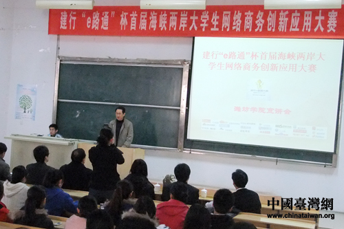 3月26日下午,首屆海峽兩岸大學(xué)生網(wǎng)絡(luò)商務(wù)創(chuàng)新應(yīng)用大賽暨第四屆大陸大學(xué)生網(wǎng)絡(luò)商務(wù)創(chuàng)新應(yīng)用大賽在濰坊學(xué)院舉行入校宣講會(huì)。(圖片來(lái)源:濰坊學(xué)院)