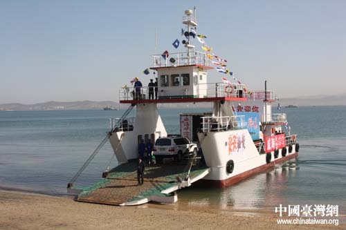 裝有臺灣梅花鹿和長鬃山羊的動物運輸車駛離登陸艦登上劉公島。(中國臺灣網 劉海偉 攝)