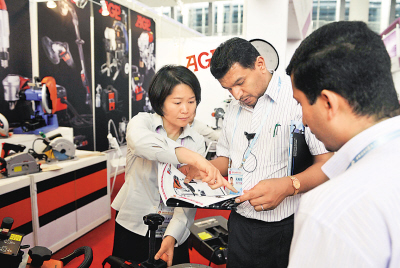 4月16日,一家生產(chǎn)專(zhuān)業(yè)電動(dòng)工具的臺(tái)企參展商(左)在第109屆廣交會(huì)上向采購(gòu)商介紹產(chǎn)品。 新華社記者 陳曄華 攝