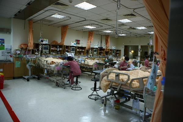 4月28日,工作人員在臺灣嘉義市圣馬爾定醫(yī)院的加護病房內(nèi)忙碌。當日,在阿里山火車事故中受傷的大多數(shù)乘客已出院,目前留在圣馬爾定醫(yī)院接受治療的還有16人,其中兩名重傷員仍在加護病房中接受治療。臺灣阿里山27日中午發(fā)生小火車翻車事故,截至當天晚間11時,事故已造成5名大陸游客罹難,百余名大陸游客不同程度受傷。 新華社記者龔兵攝