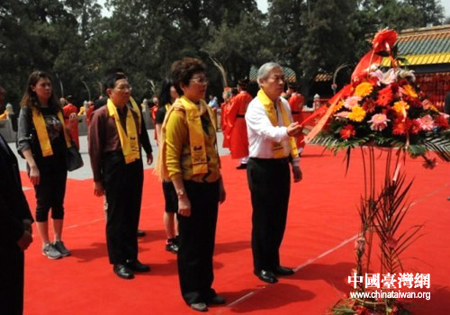 臺灣海峽兩岸觀光旅游協會名譽會長郭蔡文、會長賴瑟珍在曲阜孔廟大成殿拜謁孔子(圖片來源:山東省臺辦)