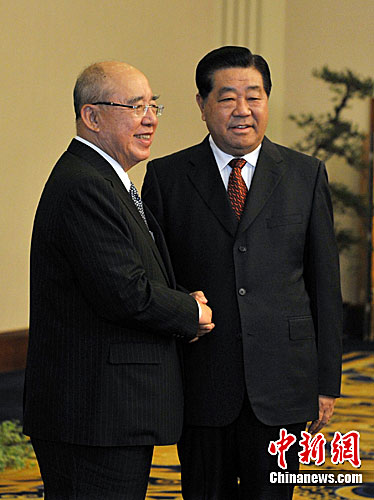 2011年5月6日下午,中共中央政治局常委、全國政協主席賈慶林在成都會見了出席第七屆兩岸經貿文化論壇的中國國民黨榮譽主席吳伯雄及應邀參加第七屆兩岸經貿文化論壇的兩岸部分嘉賓。圖為賈慶林(右)在成都會見吳伯雄(左)。中新社發 劉忠俊 攝
