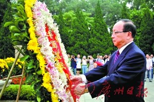 昨日下午4時30分,蔣孝嚴一行抵達廣州后直接從機場來到黃花崗七十二烈士陵園,在陵園正大門前等候的廣州市政協(xié)主席林元和上前迎接。一身深藍色西裝的蔣孝嚴,雖然已經(jīng)年近70歲,但看上去仍然精神矍鑠,在林元和的陪同下,蔣孝嚴從“浩氣長存”的大門處步行前往七十二烈士墓。
