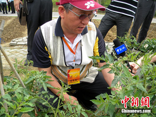 在江陰的農田中,看著剛打花苞的西紅柿枝苗,新竹縣五峰鄉的鄉長葉賢民不自覺蹲在地頭,他一邊折去枝葉,一邊向“村長”介紹,“將花蕾周圍的突枝除去,結的西紅柿會更大。”中新網發 唐娟 攝