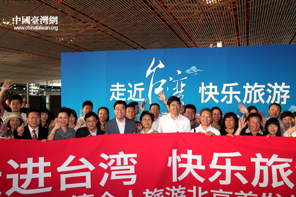 大陸居民赴臺個人游28日正式啟動。圖為當日最早出發的61名游客在首都機場告別。(中國臺灣網 于斯文 攝)