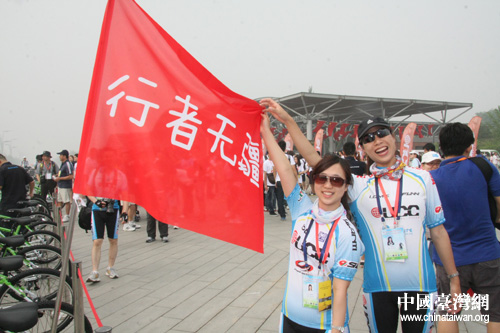 “行者無疆 綠色騎行”,兩名臺灣青年在活動(dòng)中留影紀(jì)念。(中國臺灣網(wǎng) 于斯文 攝)
