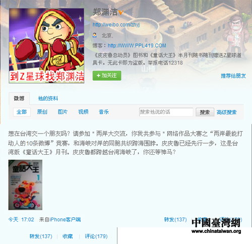 中國臺灣網7月29日北京消息 由兩岸知名網站聯合主辦的“兩岸大交流—你我共參與”網絡作品大賽,29日下午在北京啟動。“童話大王”鄭淵潔出席官網啟動儀式并現場發出微博,呼吁兩岸同胞通過網上互動,共同編織跨海“圍脖”。(記者 王偉)