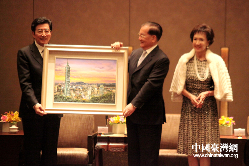 連戰(zhàn)向郭金龍贈(zèng)送畫(huà)有臺(tái)北101高樓的油畫(huà)(中國(guó)臺(tái)灣網(wǎng) 趙輝 攝)