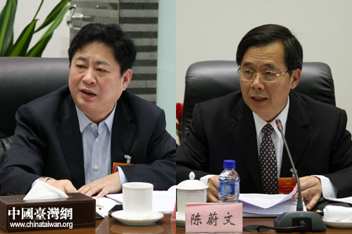 臺(tái)籍人大代表陳蔚文(右)和何大欣都將關(guān)注的目光鎖定在海峽西岸經(jīng)濟(jì)區(qū)建設(shè)上。(中國(guó)臺(tái)灣網(wǎng) 王偉 攝)