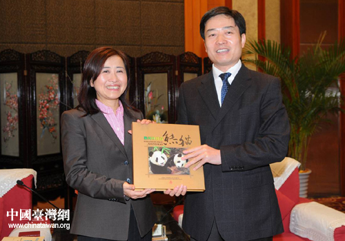 四川副省長甘霖向臺灣參訪團贈送大熊貓郵冊。
