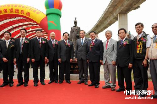 5月10日,屈原銅像落成典禮在彰化舉行,兩岸嘉賓在銅像前合影。(湖北省臺辦 陸勝 攝)
