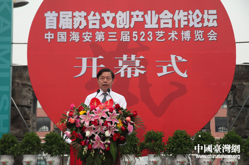 中國臺灣網6月6日南通消息 首屆蘇臺文創產業合作論壇暨中國海安第三屆523藝術博覽會6日上午在江蘇省海安縣隆重開幕,來自海峽兩岸及海內外的近千位嘉賓歡聚一堂,共同探討加強蘇臺文化交流,促進兩岸文創產業合作。國臺辦主任助理龍明彪、信息中心主任仇開明,文化部文化產業司司長劉玉珠,江蘇省臺辦副主任石細云,南通市委書記丁大衛等出席開幕式。