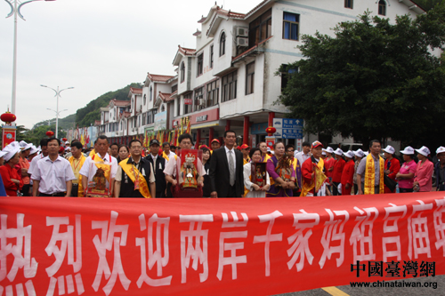臺灣的媽祖信眾懷著虔誠和激動的心情跨越海峽,踏上湄洲島這片靈氣十足的土地,道路兩旁迎接隊伍里的當地信眾告訴記者,為了迎接臺灣的媽祖信眾,他們從早晨6時就開始等候,激動之情溢于言表。隨后舉行了民俗文藝踩街活動,迎接隊伍手舉彩旗歡迎來自臺灣的媽祖信眾,隊伍浩浩蕩蕩從湄洲島宮下碼頭步行至天后廣場。隊伍中不論男女老少,一路歡聲笑語,整個湄洲島都彌漫著歡樂祥和的氣息。