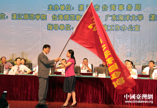 湛江市委常委、宣傳部長盧瑜(右)向夏令營總領隊授旗。(圖片來源:湛江臺辦)