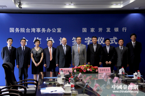 國臺辦與國家開發銀行18日在北京再度簽署合作協議,將在支持大陸臺資企業發展和陸資赴臺等領域通力合作,促進兩岸經濟共同發展。圖為雙方完成簽字儀式后合影。(中國臺灣網 普燕 攝)