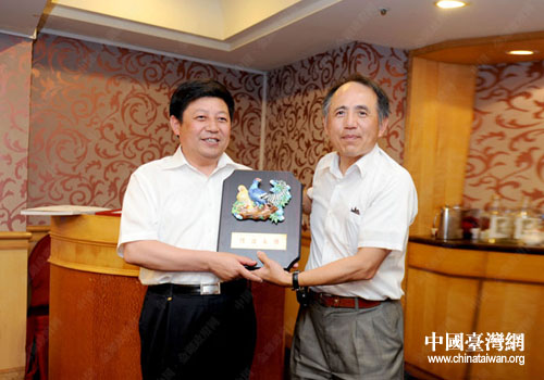 金湖縣委書記肖進方與臺北市工業會理事長魏昇煌互贈紀念品。(圖片來源:金湖縣臺辦)