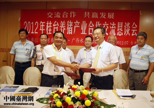 廣西水產(chǎn)畜牧業(yè)協(xié)會(huì)和臺(tái)灣養(yǎng)豬協(xié)會(huì)在臺(tái)北共同簽訂《關(guān)于促進(jìn)桂臺(tái)養(yǎng)豬業(yè)交流合作備忘錄》。(圖片來源:廣西臺(tái)辦)