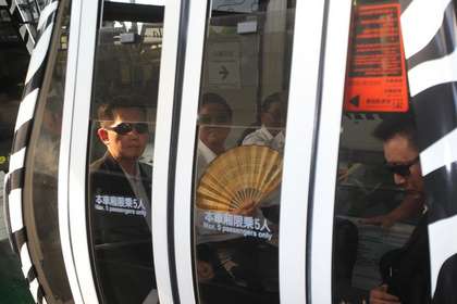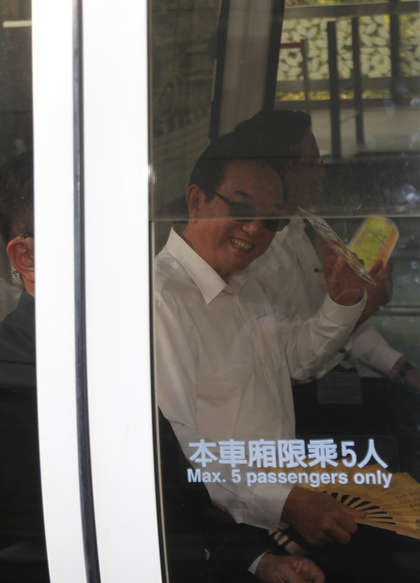 陳云林搭貓纜,自備扇子解悶熱。來源:臺灣媒體