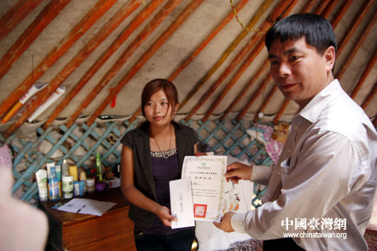額尼日樂的姐姐格根照拉從頂新公益基金會(huì)代表手中接過妹妹的獎(jiǎng)學(xué)金,心中感慨萬端(中國臺(tái)灣網(wǎng) 蕪?fù)?nbsp;攝)