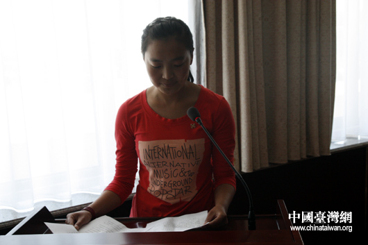 蘇日亞來自內(nèi)蒙古克什克騰旗巴彥查干蘇木恩格爾寶力格嘎查,她在發(fā)言中代表獲獎(jiǎng)學(xué)生家庭向頂新基金會(huì)表示感謝(中國臺(tái)灣網(wǎng) 蕪?fù)?nbsp;攝)