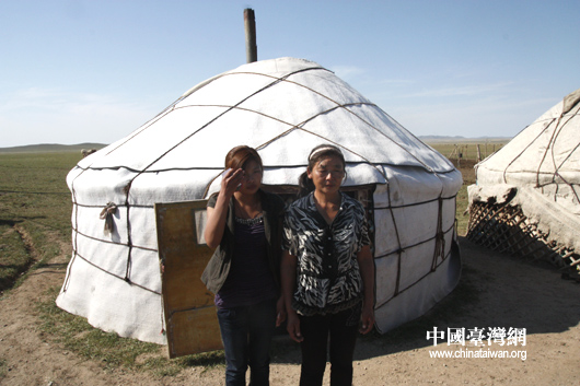 頂新公益基金會(huì)工作人員及記者與格根照拉和她的額吉蘇布達(dá)在蒙古包前合影(中國臺(tái)灣網(wǎng) 蕪?fù)?nbsp;攝)