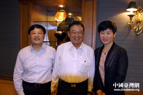 煙臺(tái)市經(jīng)貿(mào)考察團(tuán)拜訪臺(tái)灣三三企業(yè)交流會(huì),圖為煙臺(tái)市市長王良、副市長楊麗與臺(tái)灣“三三會(huì)”會(huì)長江丙坤合影。(圖片來源:煙臺(tái)市臺(tái)辦)
