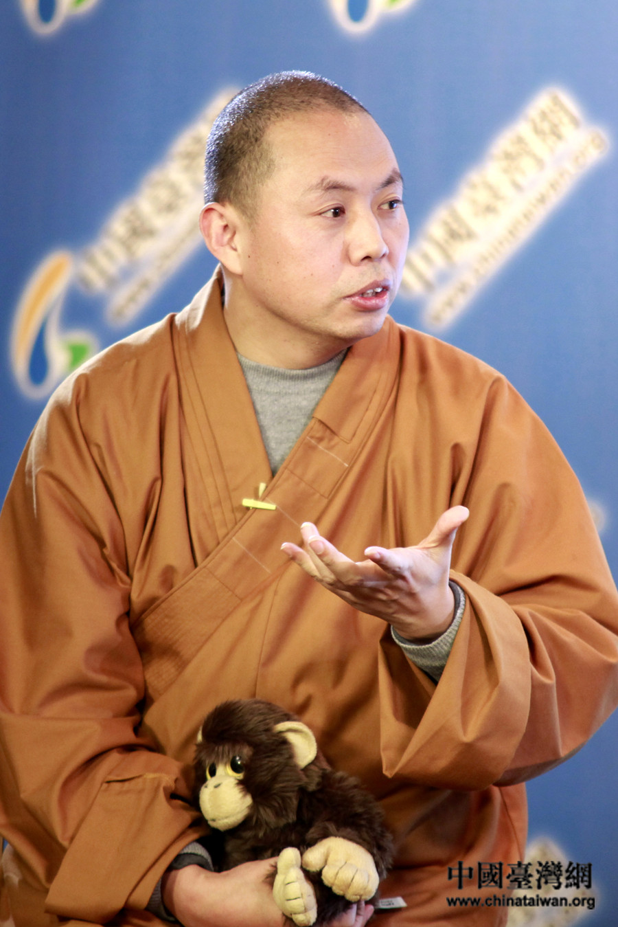 延參法師“天然萌” ,對毛絨小猴愛不釋手。(中國臺灣網 王偉 攝)