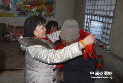 1月5日,“北京臺灣城”28名員工在董事長郭瑞先帶領(lǐng)下來到阜平縣, 為駱駝灣村每家每戶送去過冬物資。圖為“北京臺灣城”董事長郭瑞先為村民帶上圍巾。(中國臺灣網(wǎng)發(fā))