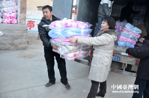 1月5日,“北京臺灣城”28名員工在董事長郭瑞先帶領(lǐng)下來到阜平縣, 為駱駝灣村每家每戶送去過冬物資。(中國臺灣網(wǎng)發(fā))