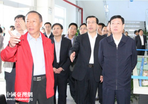 鴻海集團董事長郭臺銘陪同山東省委書記姜異康、煙臺市委書記張江汀等領導參觀富士康煙臺工業園。(圖片來源:煙臺市臺辦)